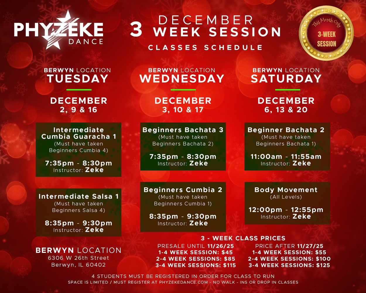 - All make-up classes must be made up within the same month of registered 4-Week Session